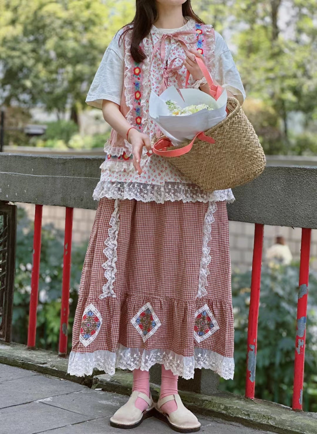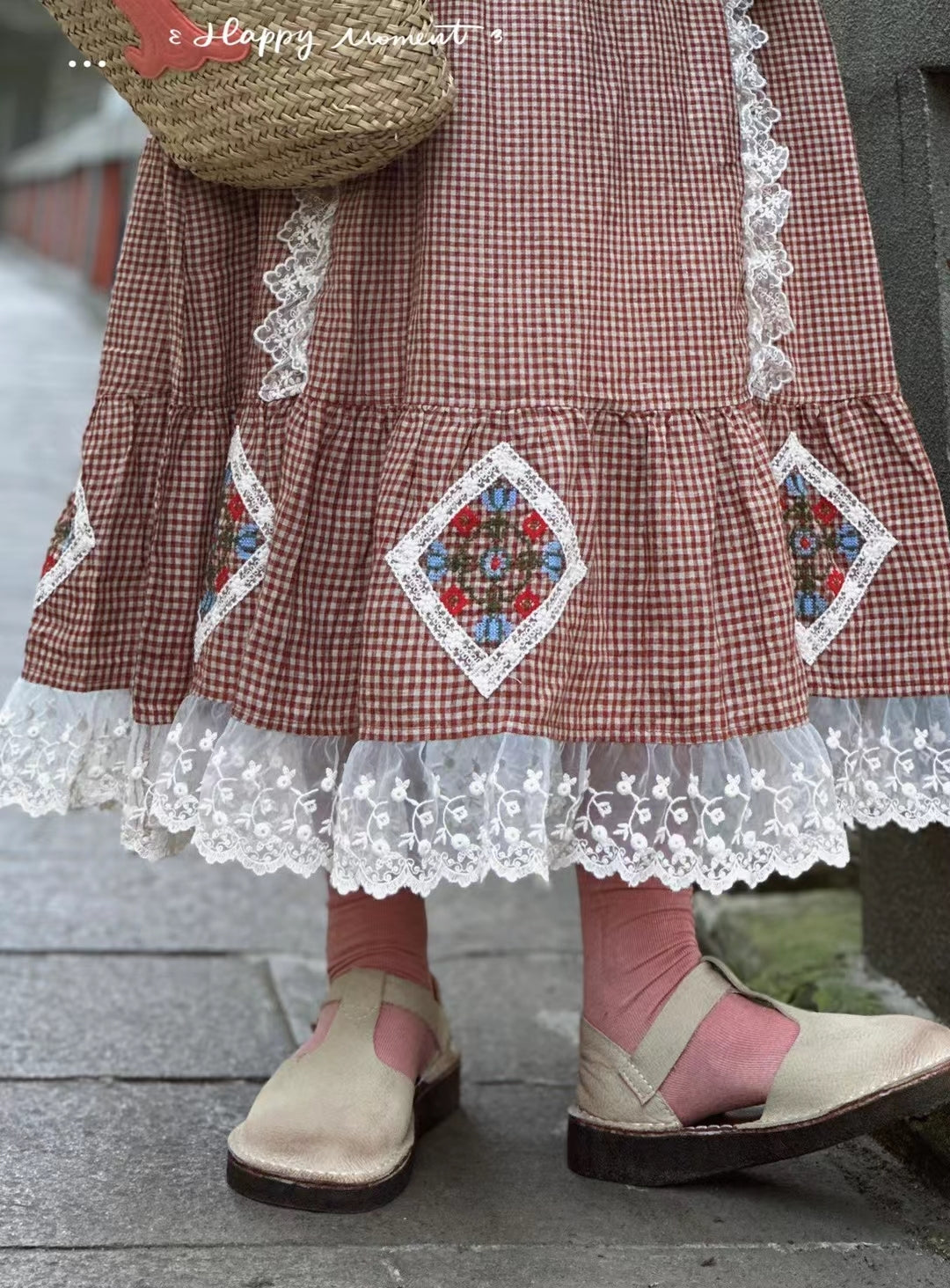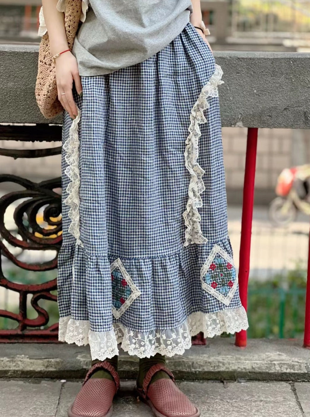 Prairie Style Lace Trim Plaid Skirt