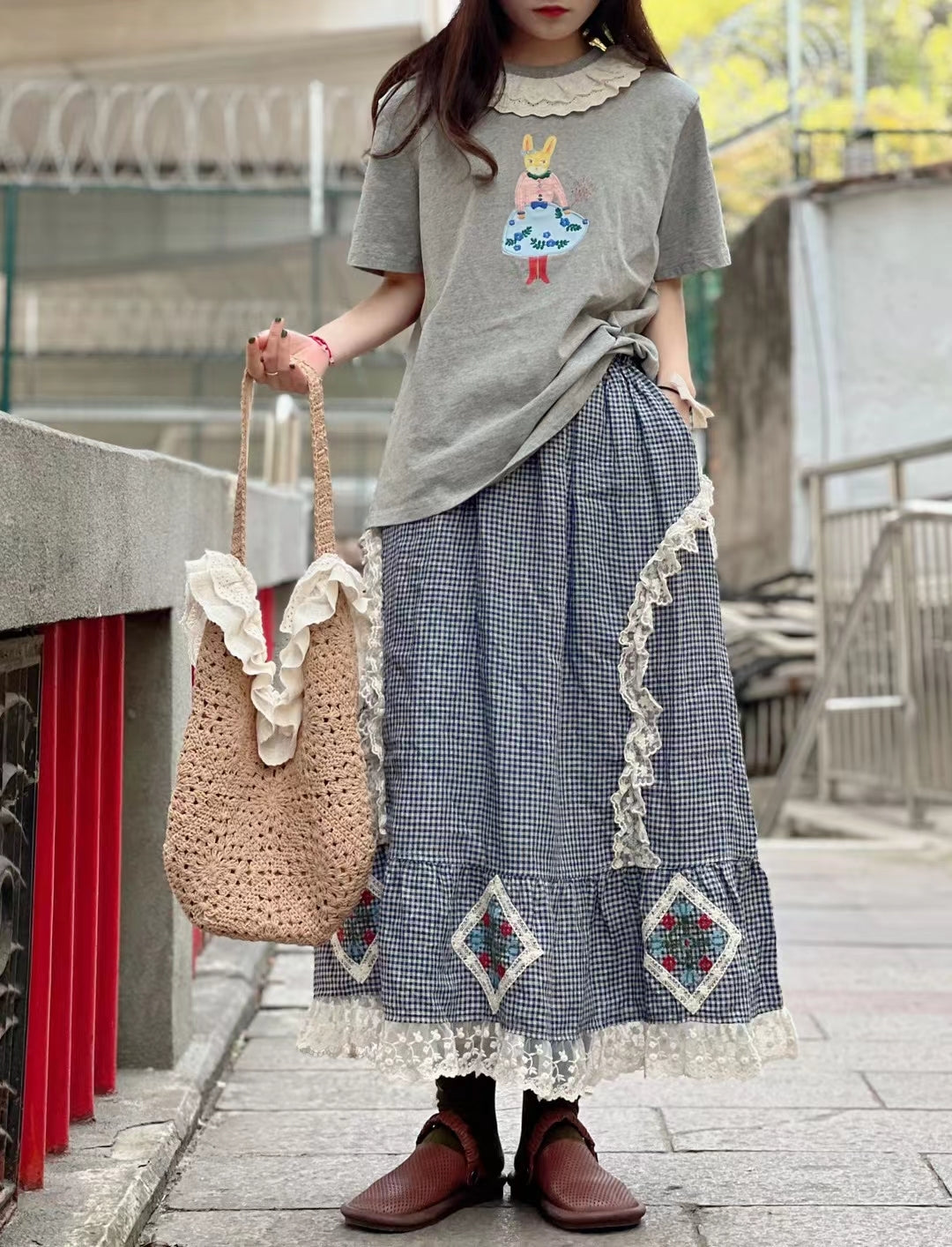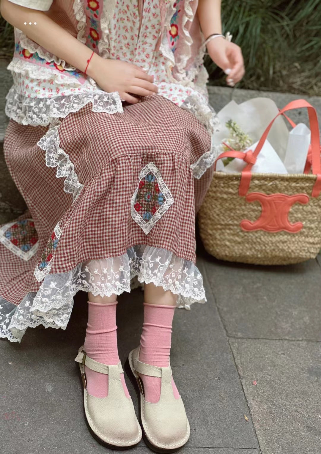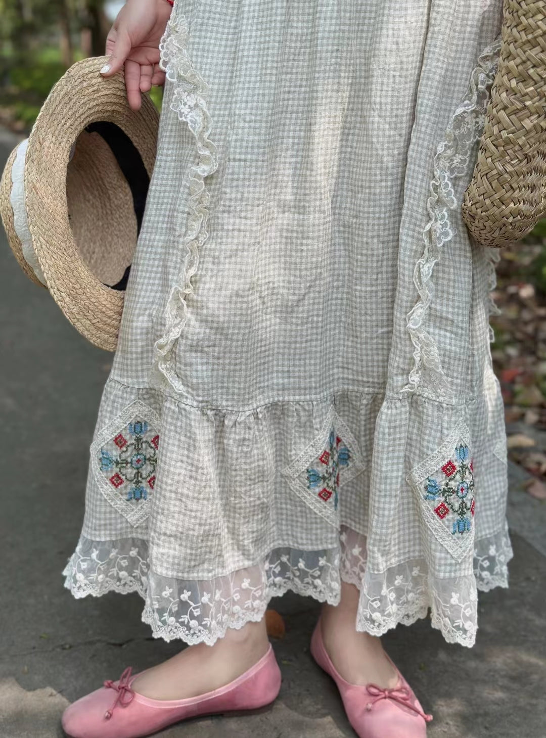 Prairie Style Lace Trim Plaid Skirt